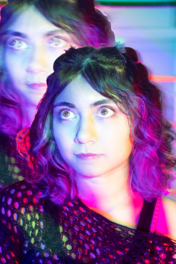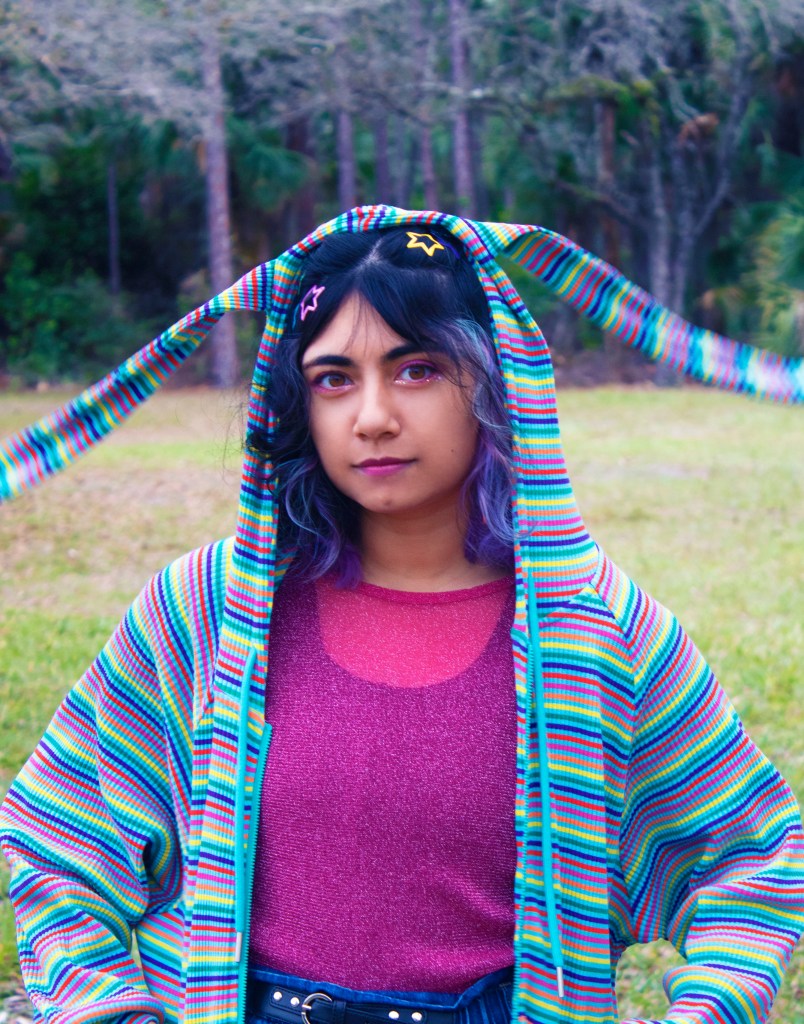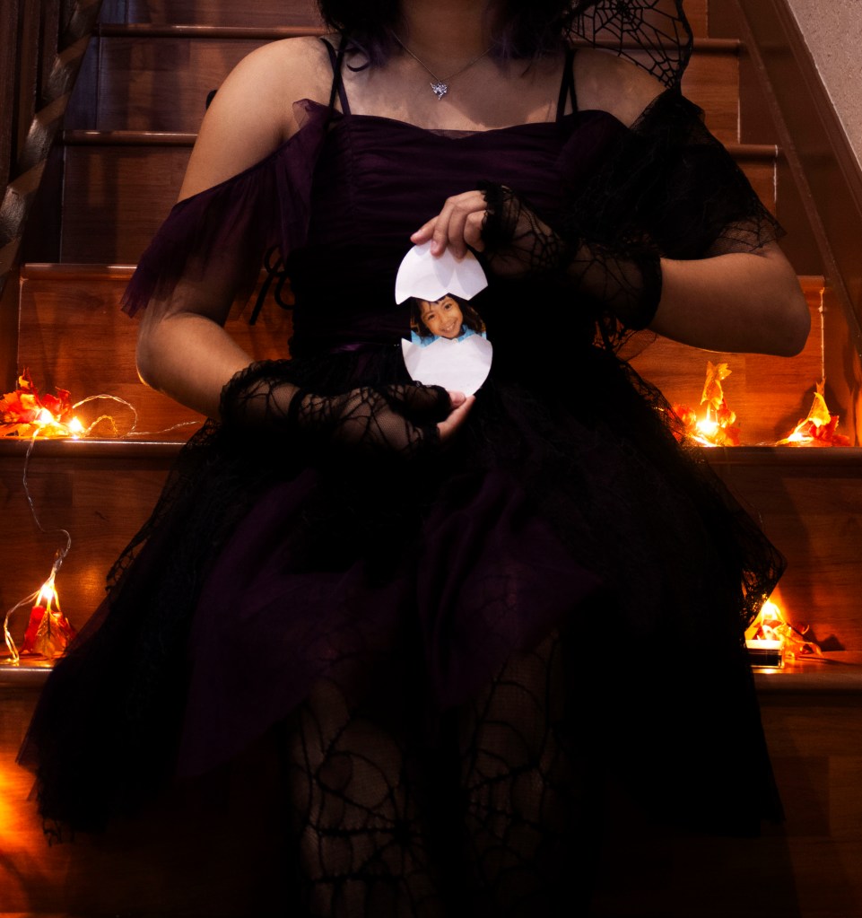 The easiest way to express who I am is by how I dress. Being born on a holiday, I wanted to display this by dressing in purple and black with spider webs. Surrounded by autumn leaves and warm lights against the dark wood stairs, I wanted to create a spooky yet warm, nostalgic feeling of my early years of life. Flash forward to now, I dress myself and the world around me in bright, vibrant colors. Even when there is bleakness going on in the world, I wanted to share that there are still the brighter things worth living for. That is what I see through my eyes, and I hope to see the happy thoughts I dream of to be seen in reality.
